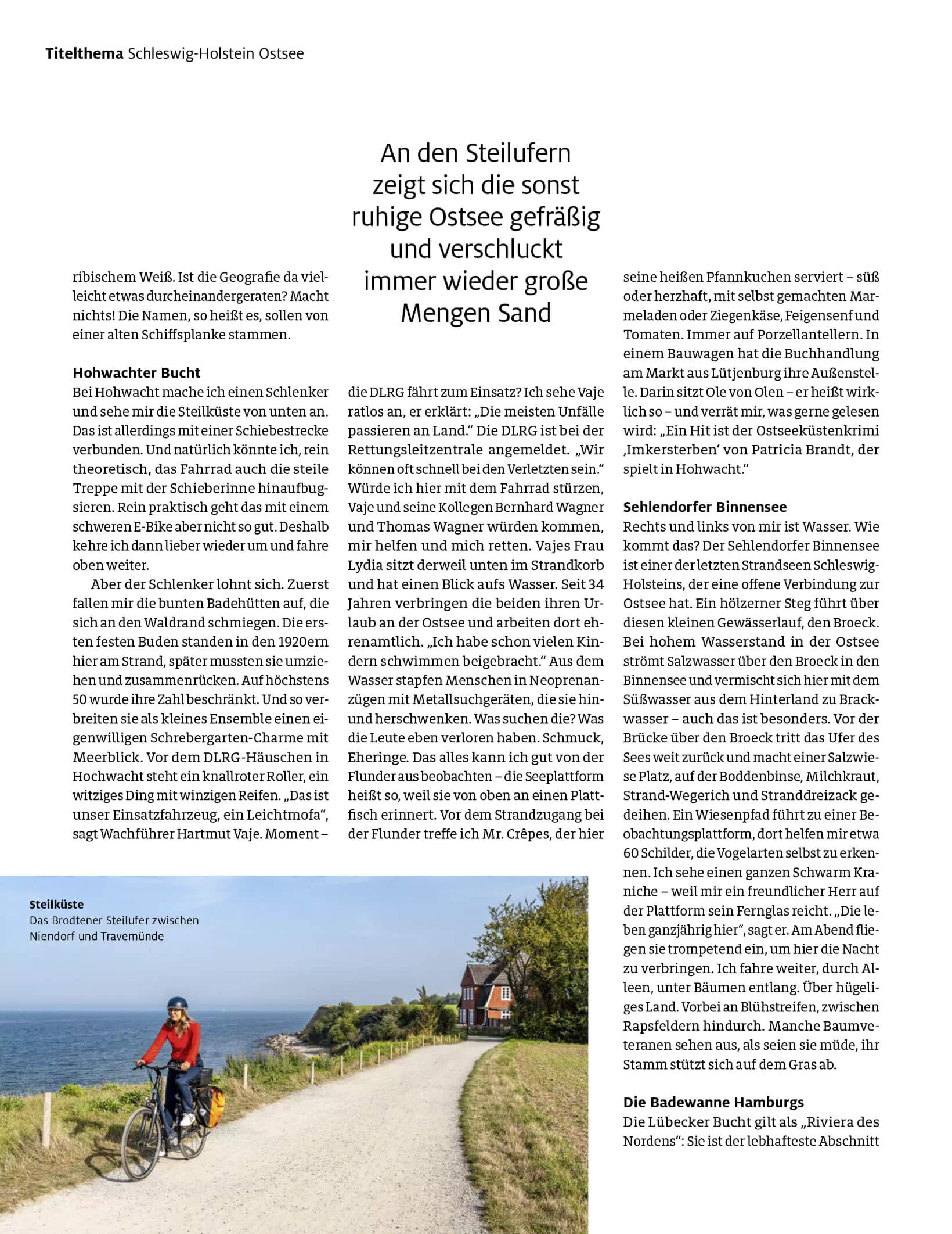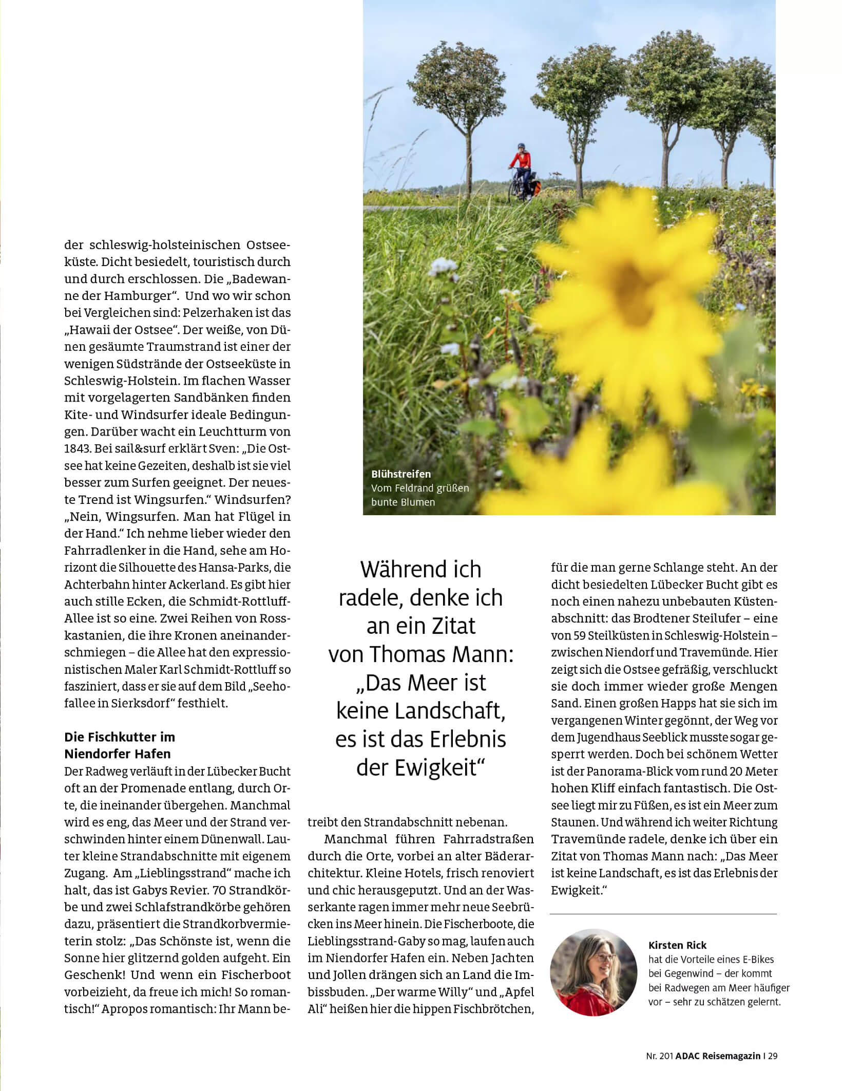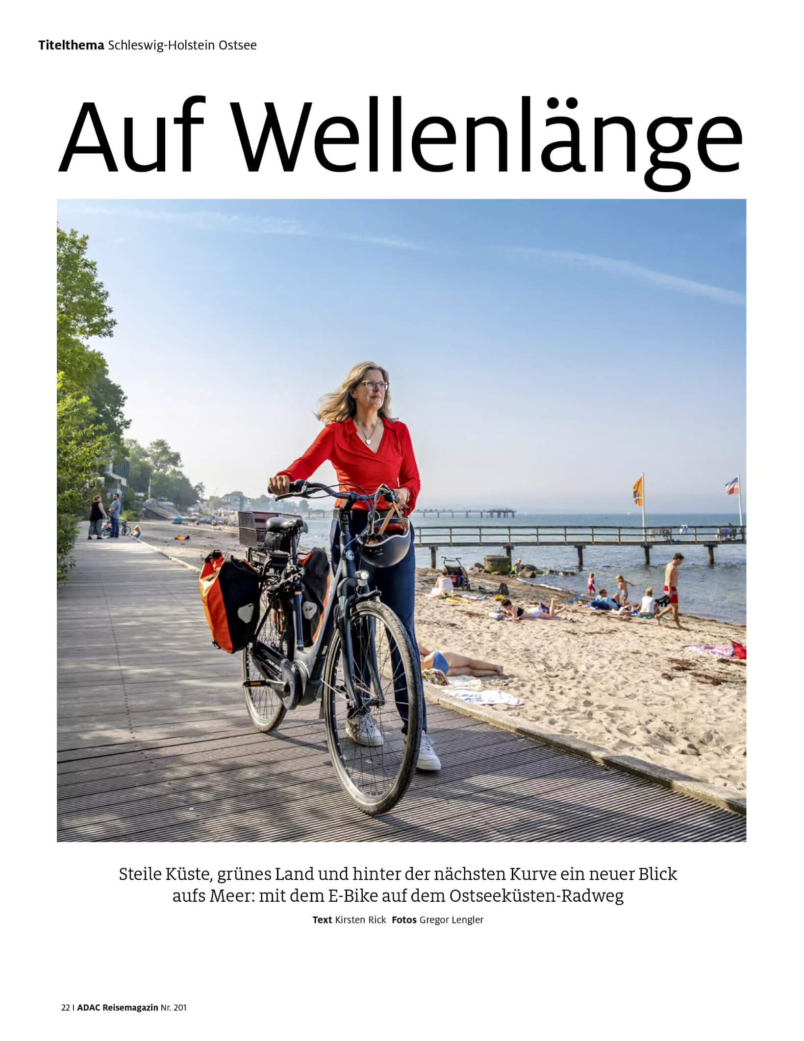 Seite aus dem ADAC Reisemagazin Ostseeküstenradweg Kirsten Rick schiebt ein E-Bike