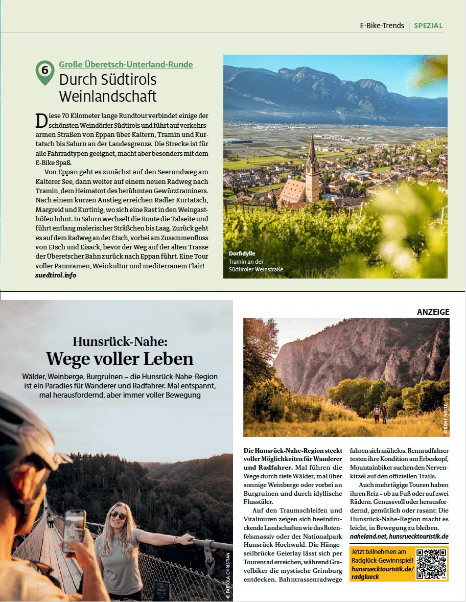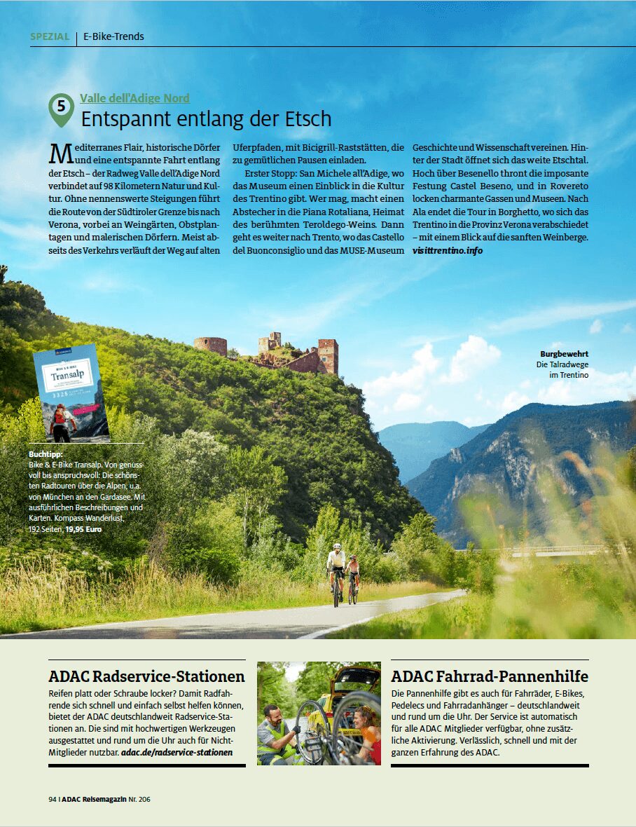 Für das ADAC Reisemagazin Mai/Juni 2025 habe ich das Spezial E-Bike Trends recherchiert und geschrieben.