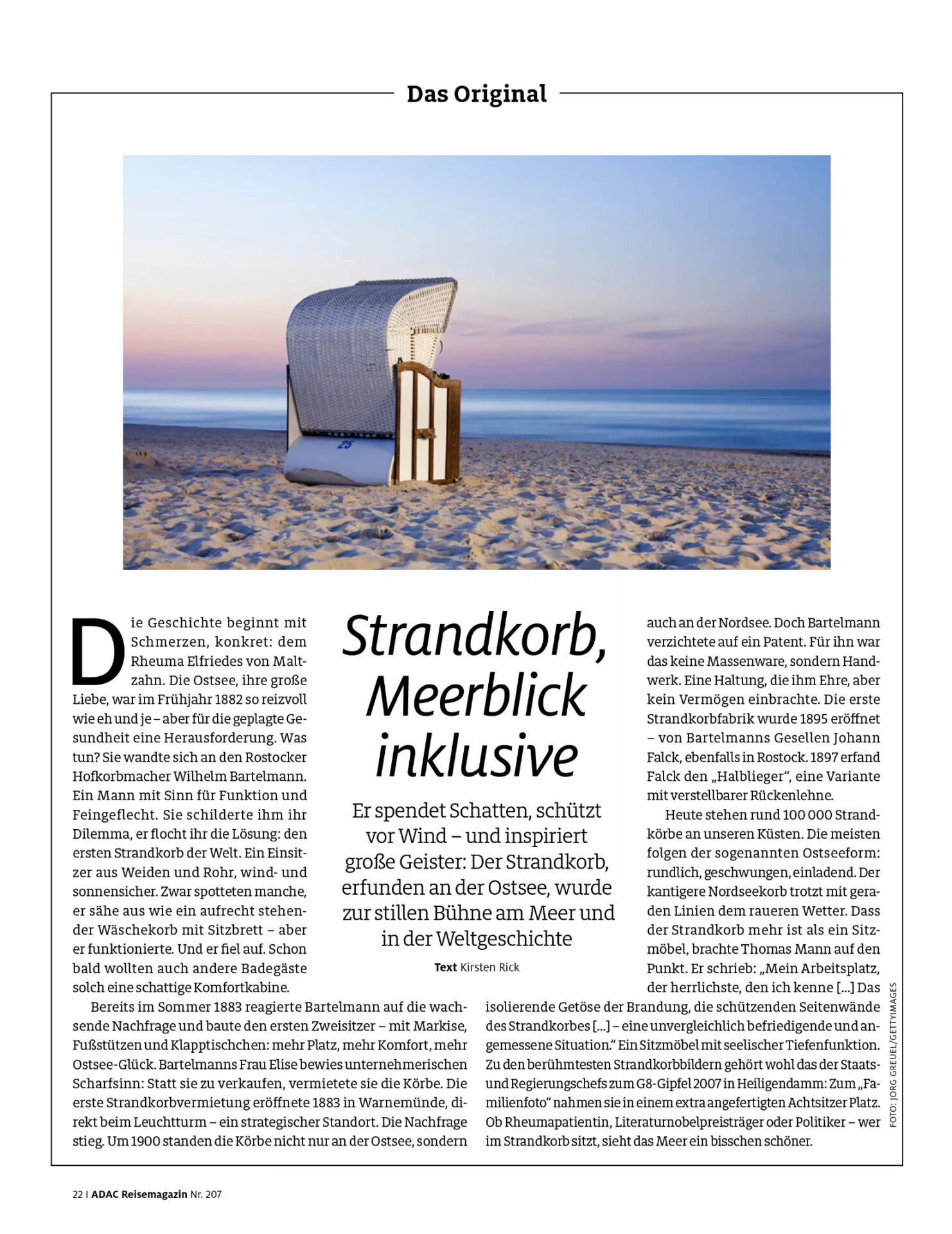 Für die Rubrik „Das Original“ im ADAC Reisemagazin Juli/August 2025 habe ich mich in der Geschichte des Strandkorbs umgeschaut.