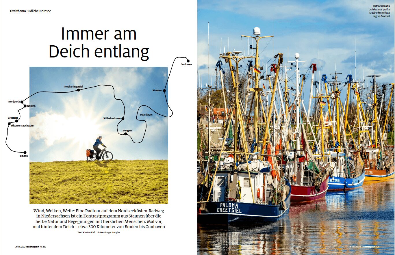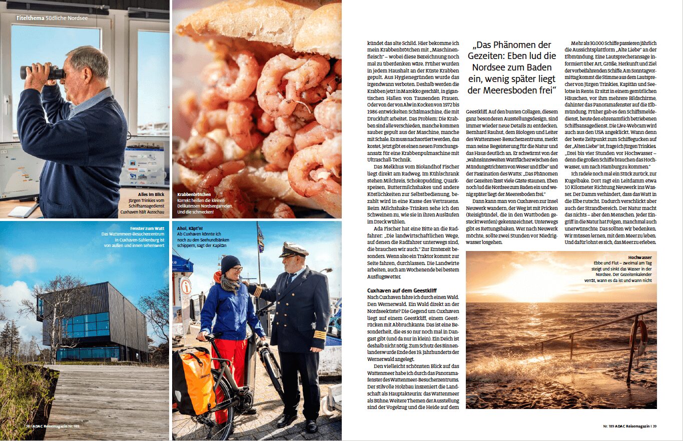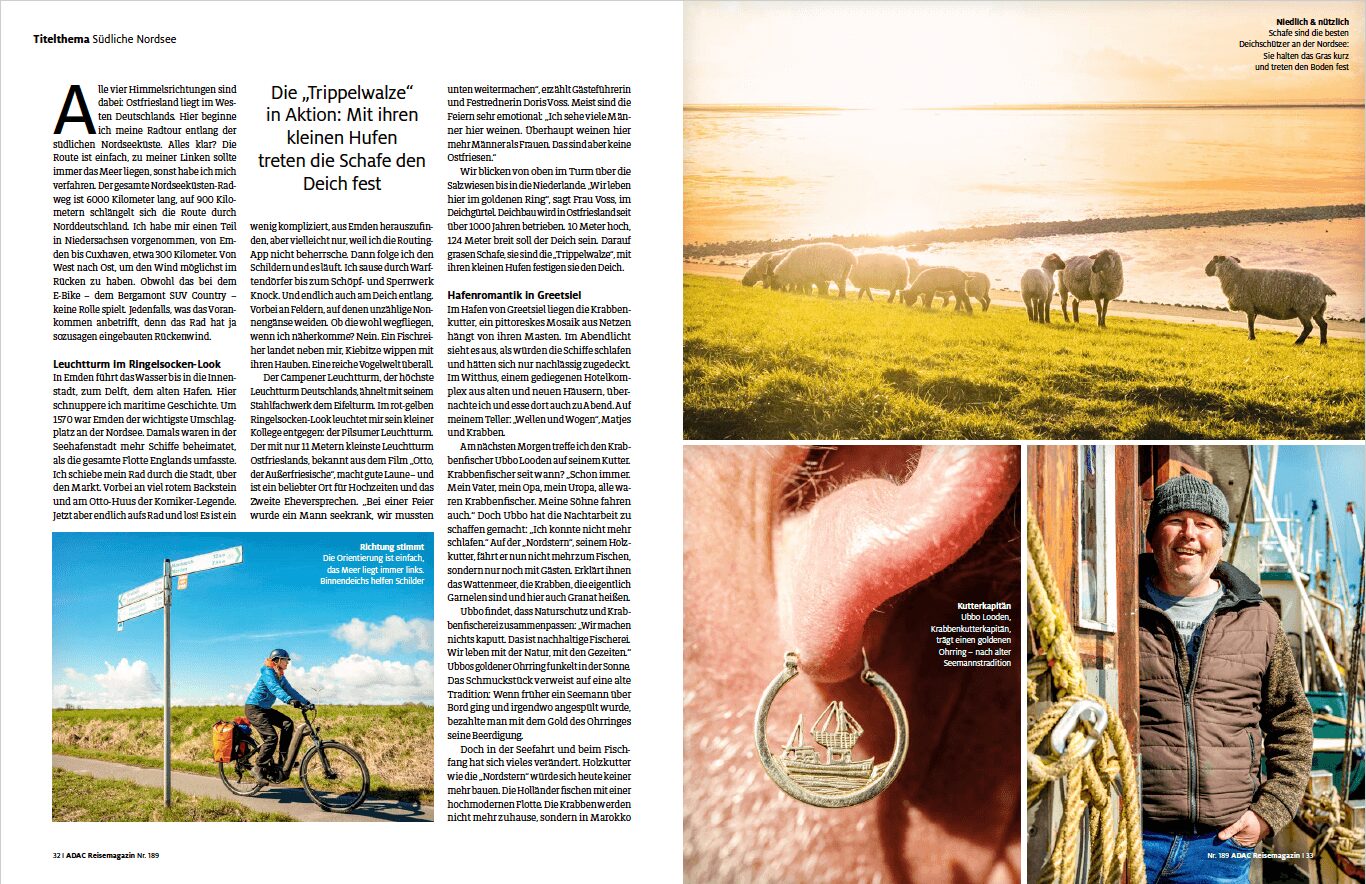 Für das ADAC Reisemagazin Juli/August 2022 war ich an der Nordseeküste unterwegs – bei Kälte, Regen und Wind von vorn. Zum Glück auf einem E-Bike. An den Tagen, an denen der Fotograf Gregor Lengler mitgeradelt ist, kam die Sonne dann doch durch. Ein paar der Fotos in dem Beitrag sind auch von mir.