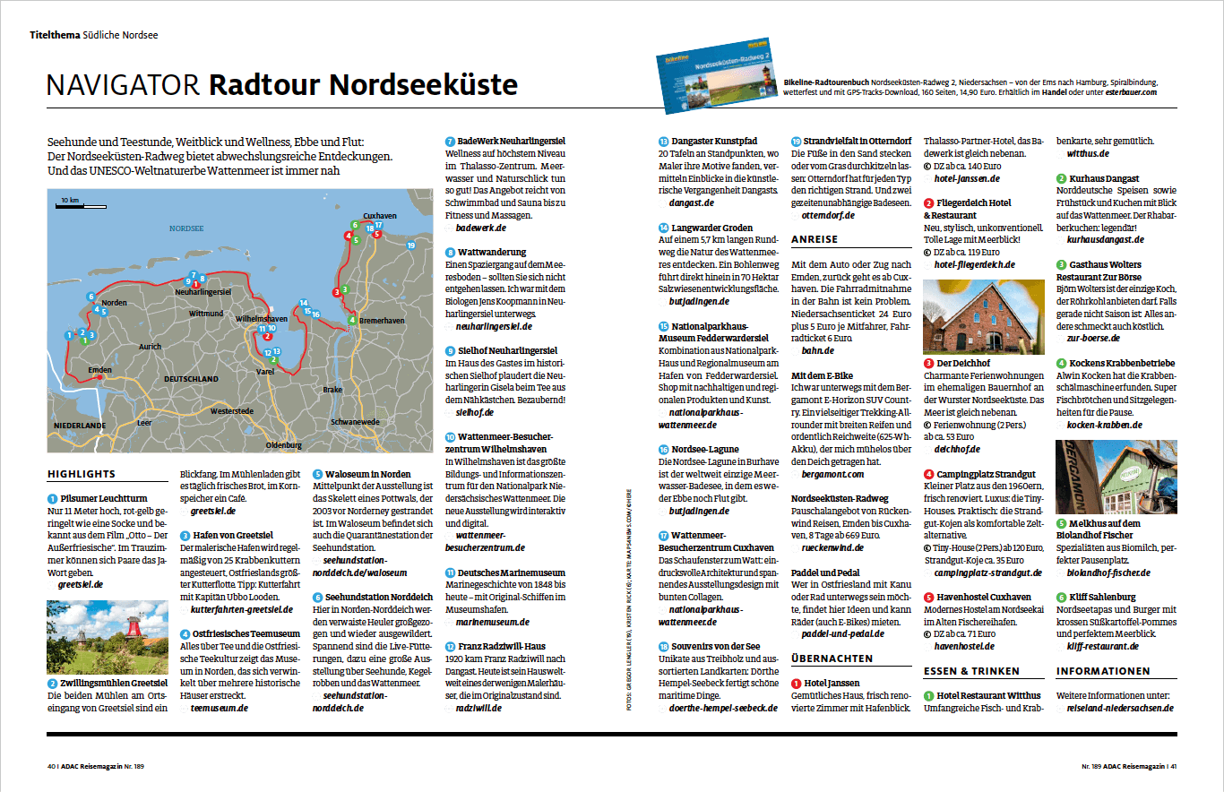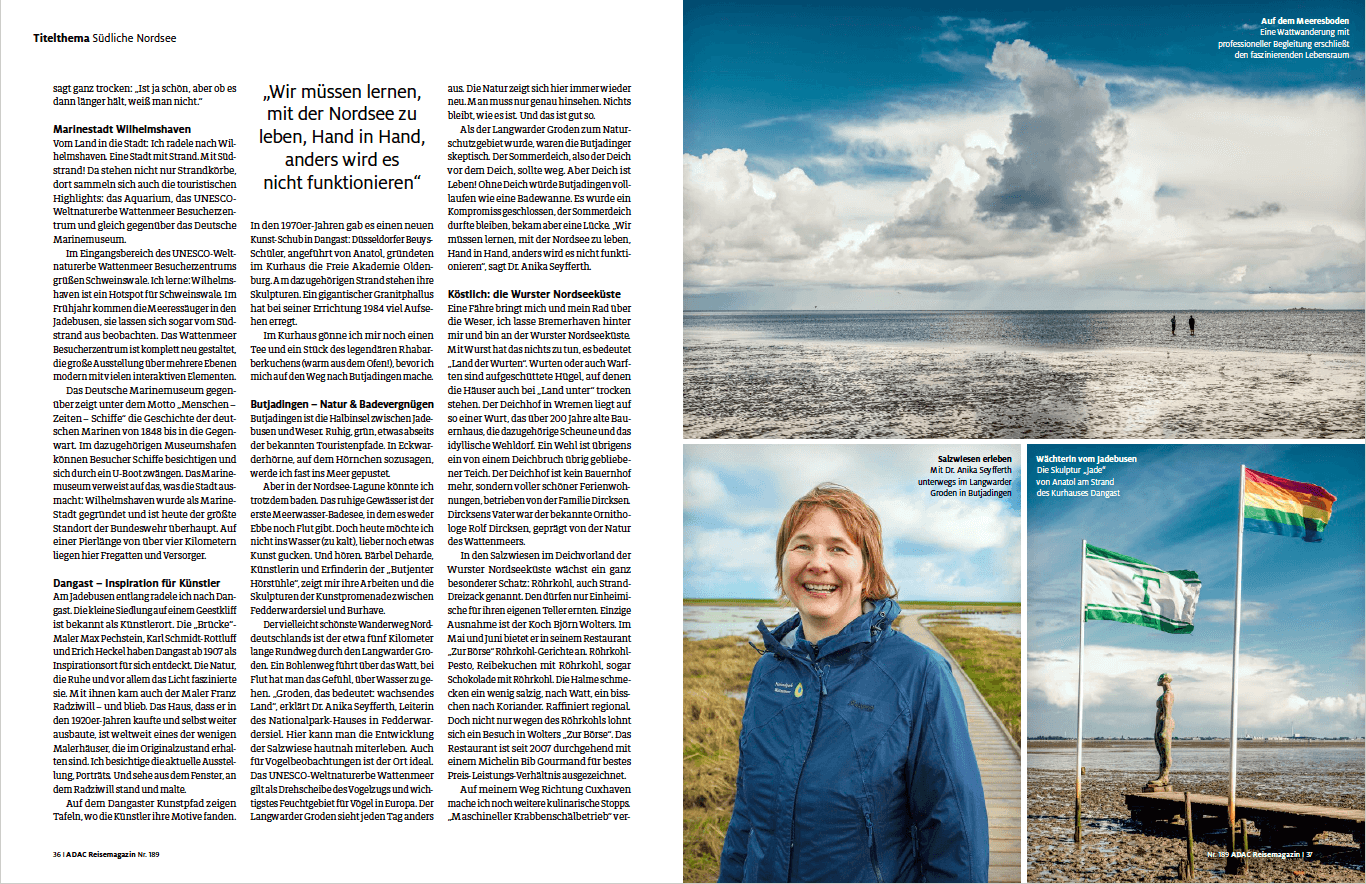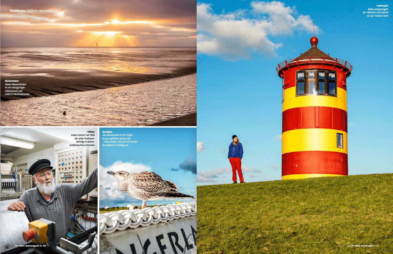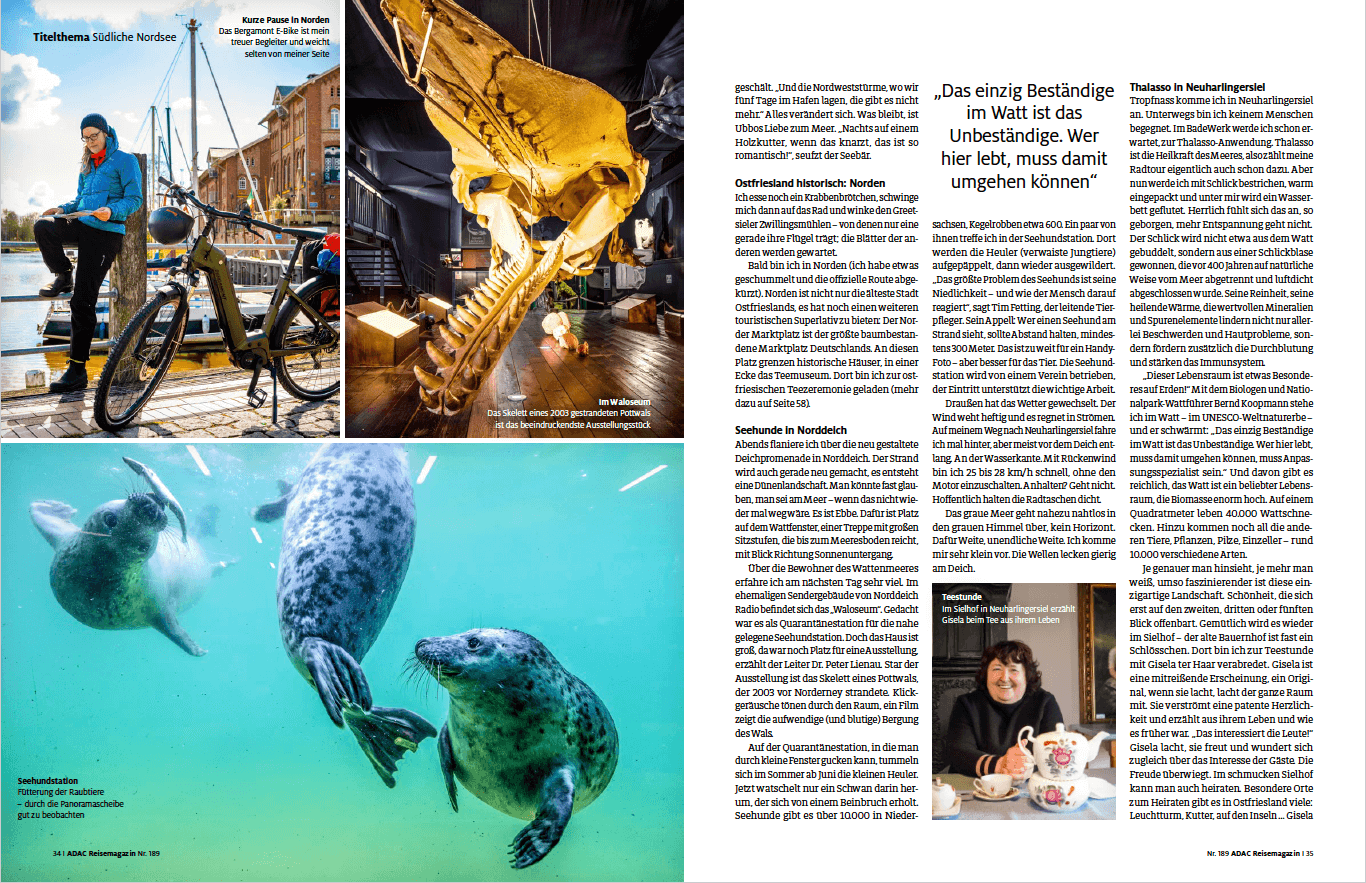 Für das ADAC Reisemagazin Juli/August 2022 war ich an der Nordseeküste unterwegs – bei Kälte, Regen und Wind von vorn. Zum Glück auf einem E-Bike. An den Tagen, an denen der Fotograf Gregor Lengler mitgeradelt ist, kam die Sonne dann doch durch. Ein paar der Fotos in dem Beitrag sind auch von mir.