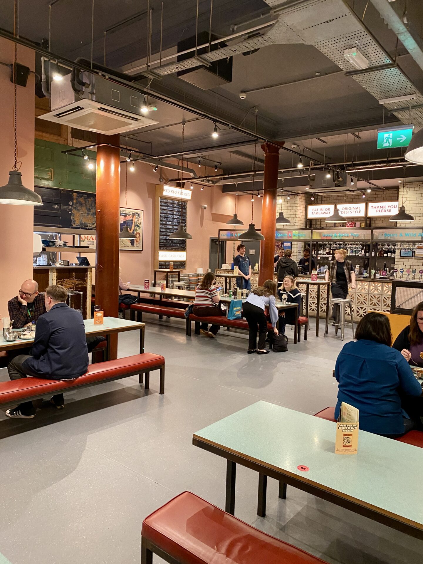 Als uns die Mitarbeiterin die Tasse einpackt, kommen wir ins Gespräch: Sie mag unsere Heimatstadt Hamburg, ihr Freund ist der Drummer von The Fall (Buchtipp: „You can drum, but you can‘t hide“), die haben dort viele Konzerte gespielt. Bei einer Deutschland-Tour war Nirvana die Vorband von The Fall. Sie empfiehlt uns die Curry-Meile, das passt, da wollen wir sowieso hin.