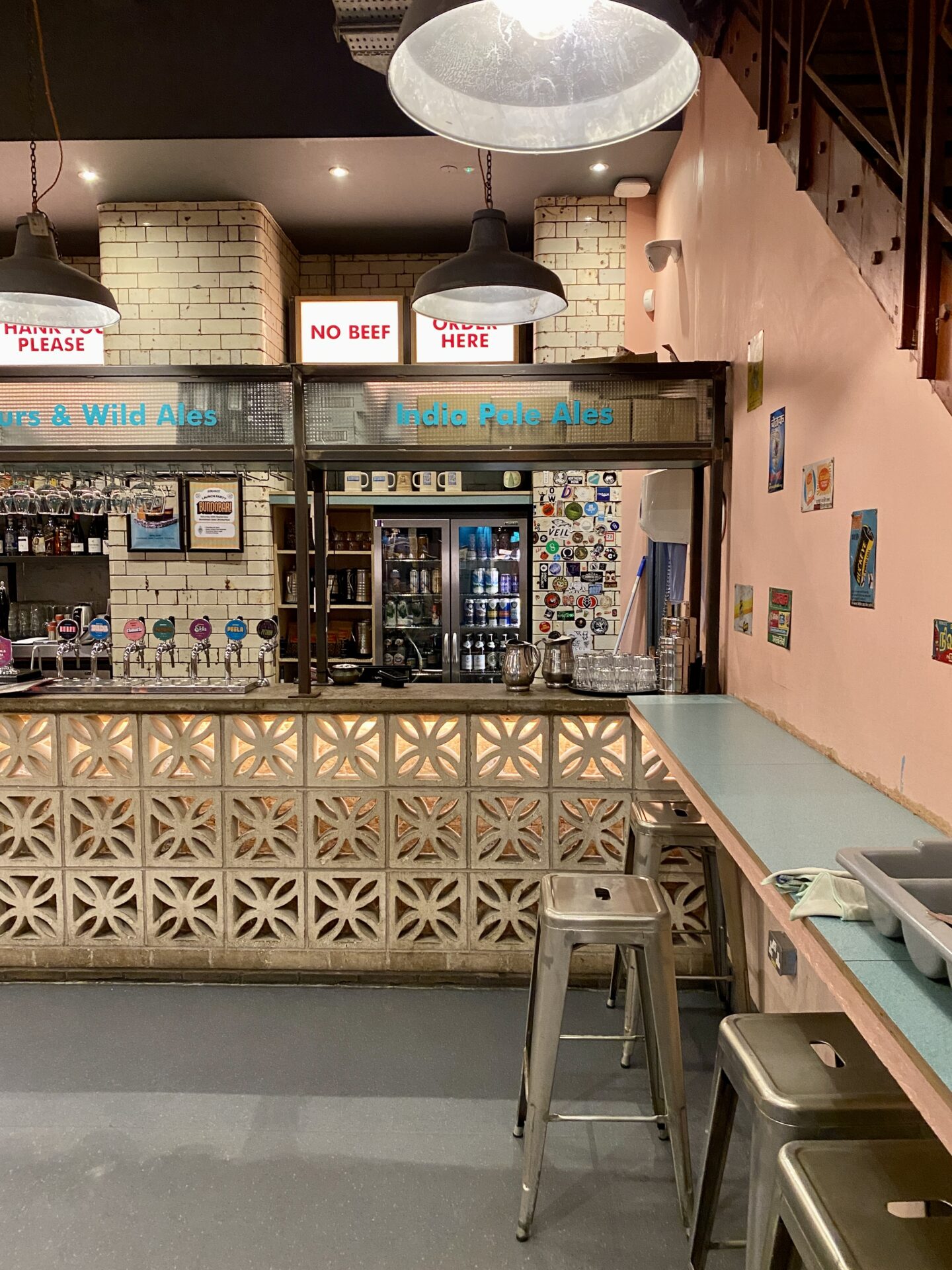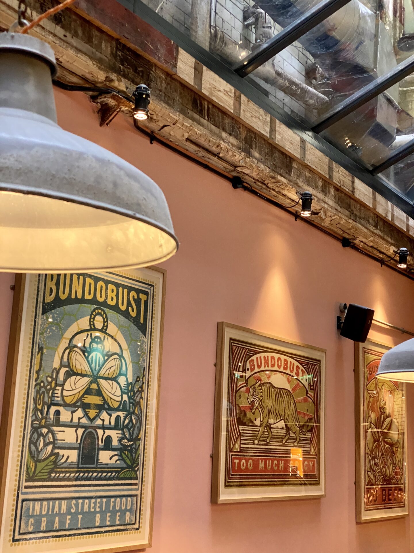 Wie bekommen Samosa-Chaat, schön knusprig, Okra Fries, kross und gut gewürzt. Dazu natürlich Mango Lassi. An der Bar werden die Biere gezapft, die in der Bundobust Brauerei in der Oxford Street gebraut werden.